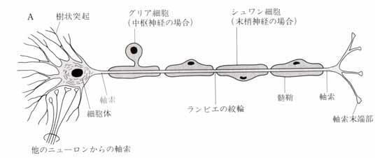 その軸索の周りにはその支持のためのシュワン細胞が包み込んで他の組織と直接接することがないようにしている。